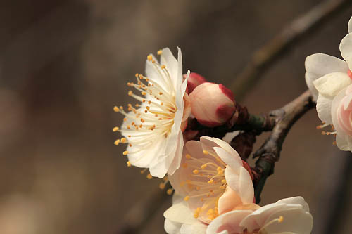 ![]() 今年も梅の花を求めて府中市にある郷土の森へ行きました。依然と同じく、やはり雲が出て冷え込んだため早々に退散。曇り空のせいか、花の色も冴えませんでした。 |