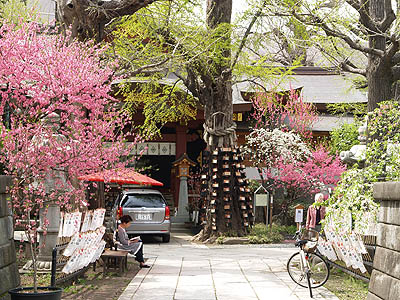 素盞雄神社の祭神は瑞光(ずいこう)石と呼ばれる石だそうで、近所には瑞光小学校もありました。菊桃という細長い花びらの桃がピンクの花を咲かせていました。 |