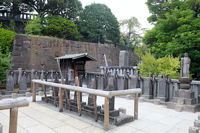 品川駅の手前に高輪大木戸の跡と泉岳寺があります。現在は高輪ゲートウェーの開発で影が薄くなっていますが、石垣が残っています。また忠臣蔵で有名な泉岳寺は、外国人観光客が多く、四十七士の墓に線香をあげていました。
