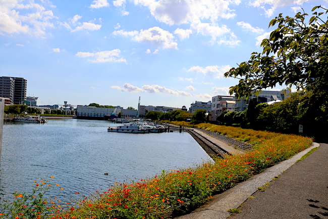 | 鮫洲駅から海側にいったところに品川花海道があります。春に桜をはじめ、季節ごとに花が咲くように整備され、企業や個人が区画ごとに手入れをしているようです。 |