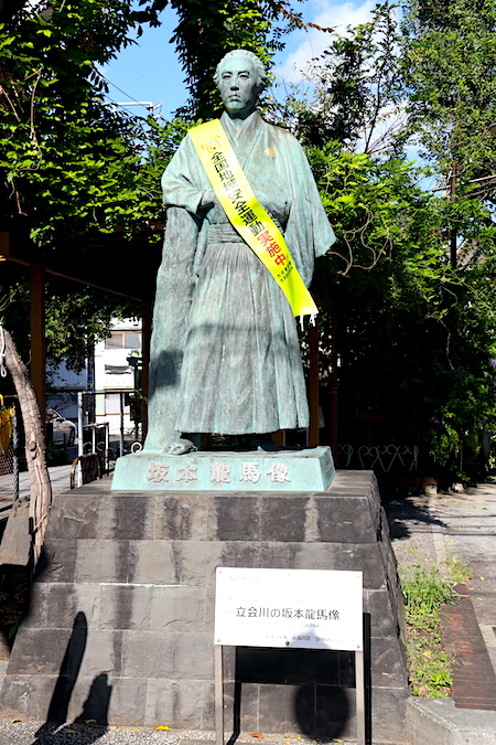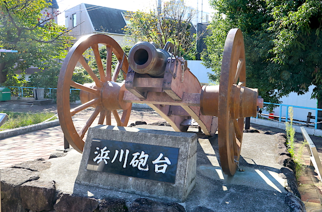 | 立会川駅の近くの公園には、附近に土佐藩の藩邸があったこともあり、幕末につくられた浜川砲台のレプリカがあります。坂本龍馬も剣術の修行で江戸に来ていたこともり、龍馬像があります。 |