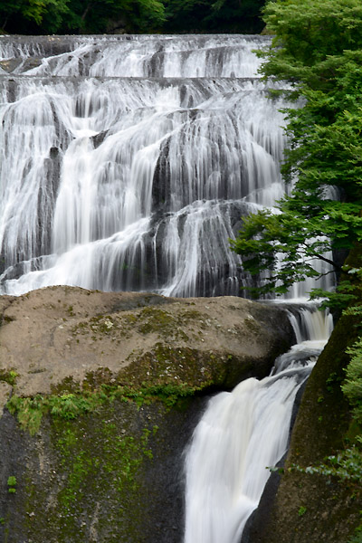 | 白く糸を引くように流れ落ちる桜田の滝。新しい展望施設が完成し、上の方からも滝を見ることができるようになり、下からの迫力ある水の落下と上からの全体像が楽しめます。 |
