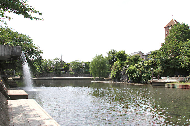 | 上の写真は大垣城の堀。親水広場となっています。他の湧水は、それぞれ市内各地にあり、公園や神社の中や街角などに湧出しています。 |