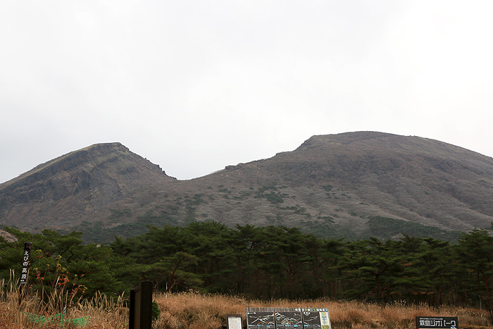 | 霧島の北側、えびの高原にあるビジターセンターから見た韓国岳(からくにだけ)。ここに車を停めて山に登る人も多いようです。下は隣にある硫黄山と、その登山口から見た韓国岳。硫黄山からは硫化水素が出ており、植物の姿は見えません。 |