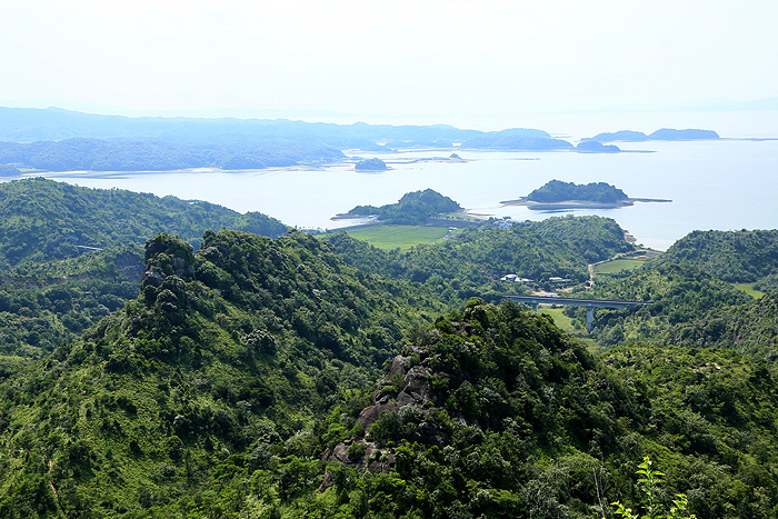 | 天草5橋を渡った上島にある千巌山の展望台からの風景。雲仙の山々は、雲がかすんで見えませんでしたが、山頂の周りをトビが悠々と飛び回っていました。 |