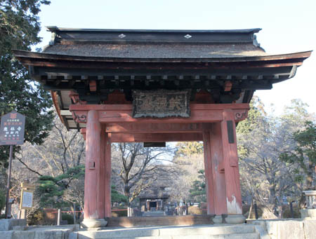 | 黒門から参道を歩いたところにある四脚門(赤門)。織田信長に焼かれた後、1606年に徳川家康によって再建されたもの。 |