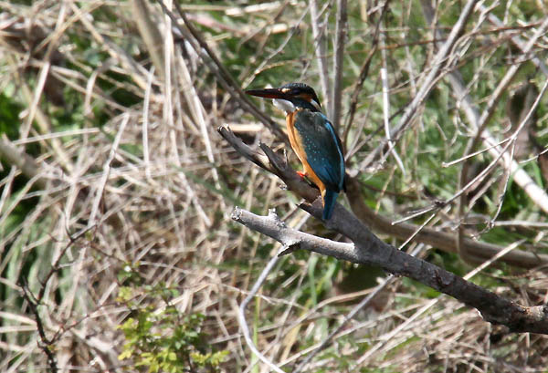 | カワセミ:今回は晴れていたので、鮮やな羽を楽しめました。風が強く、池にさざ波がたっていたせいか、しきりに首をひねっては魚の姿を追い求めていました。 |